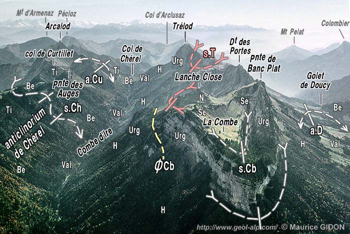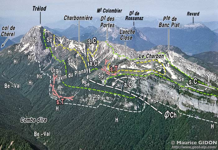 ØCh = chevauchement du Charbon ; s.C = synclinal du Charbonnet ; a.C = anticlinal du Charbonnet et du Charbon ; s.T (en rose) = synclinal du Trélod proprement dit (charnière principale du synclinorum).