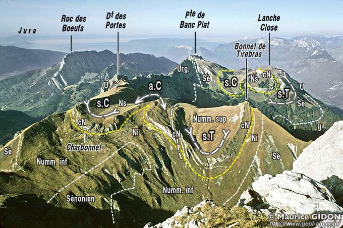 Sous cet angle on voit bien comment, au sud (à gauche) de la Dent des Portes et du ravin du Planay, la charnière du synclinal du Trélod, orientée moins N-S que le synclinal du Charbon déforme celui-ci : comme elle est déversée vers l'ouest (vers la droite) elle redresse le plan axial de ce pli ainsi que celui de l'anticlinal du Charbonnet (qui s'avère être le crochon anticlinal du chevauchement du Charbon, dont l'Urgonien réapparaît au fond de l'entaille du ravin).