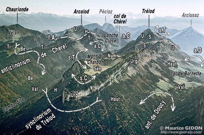 Par ailleurs, toujours au nord du ravin du Planay, l'Urgonien du flanc oriental du synclinal du Trélod (qui forme le sommet de cette montagne) est totalement enlevé par l'érosion et ne forme donc plus le rebord oriental du val perché. En définitive il faut donc considérer que la structure d'ensemble n'est pas celle d'un simple synclinal mais celle d'un synclinorium*, dont les ondulations secondaires sont légèrement obliques à l'allongement d'ensemble de la montagne (moins méridiennes) et changent par ailleurs assez sensiblement d'attitude, du nord au sud (plus de détail à ce sujet en fin de cette page).
