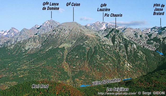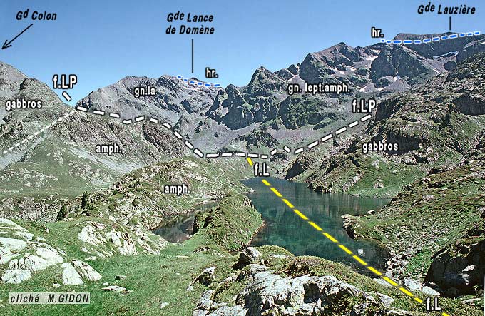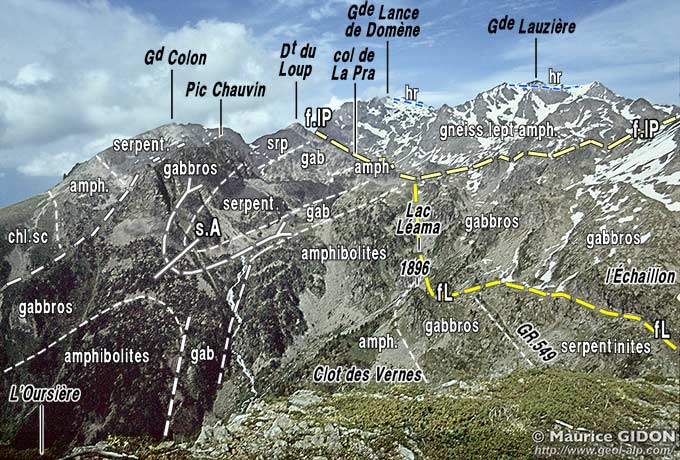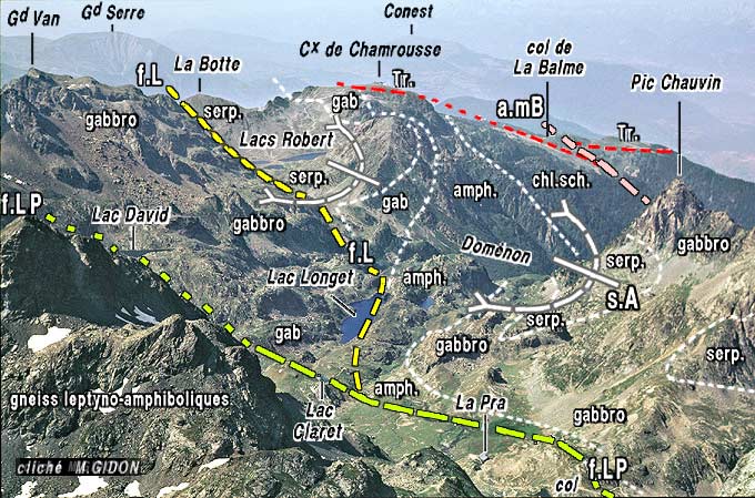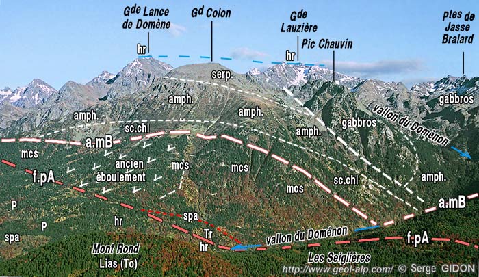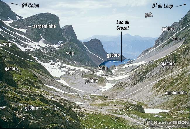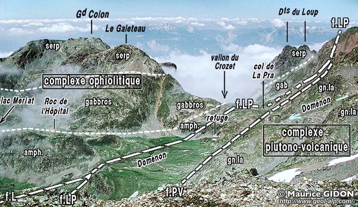 Dans le vallon du Crozet le chapeau de serpentinites du Grand Colon est, comme normal dans la succession ophiolitique, séparé des amphibolites qui affleurent au revers sud de la montagne (Roc de l'Hopital) par un puissant coussin de gabbros. Par contre, plus à l'ouest, dans le versant de la montagne qui s'infléchit progressivement pour tomber vers la basse vallée du Doménon, il repose directement sur les amphibolites. Cette absence locale des gabbros est énigmatique (sans doute est-elle due au jeu d'accidents tectoniques ayant joué pendant ou peu après la formation de la croûte océanique ?). |