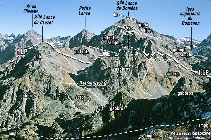 Le vallon du Crozet traverse cette succession ophiolitique. Mais cette dernière ne se poursuit sur sa rive droite que dans les seules parties basses des crêtes occidentales de la Grande Lance, car plus haut l'accident de la Pra la coupe en traversant à flanc de pentes.