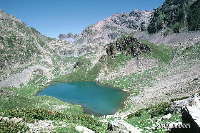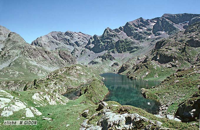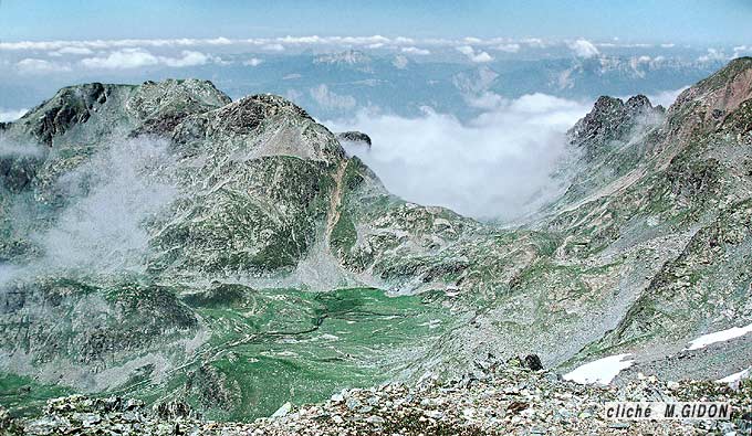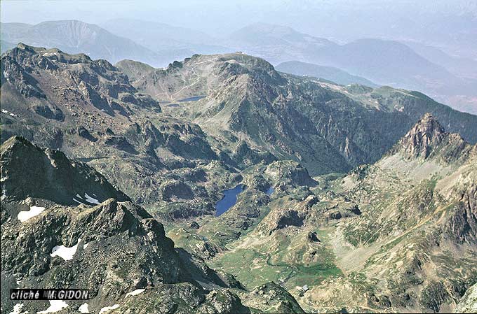 ![]() Le vallon du Mercier et le lac du Crozet, vus d'amont, du sud-est, depuis le col de La Pra Les serpentinites sont logées dans un berceau synforme* assez étroit, que le vallon coupe presque orthogonalement et dont le flanc oriental se relève assez fortement en rive droite aux approches de la faille de La Pra. Cette dernière s'élève depuis le col dans le versant de la Dent du Loup, un peu plus à droite que la limite du cliché. |