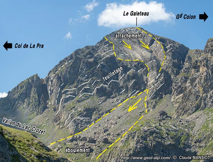Le sommet secondaire du Galeteau, qui domine le versant sud-occidental du vallon du Crozet se fait remarquer par une particularité assez spectaculaire. En effet il a été l'objet d'un assez gros éboulement dont les caractéristiques, assez exemplaires, sont bien visibles depuis le vallon du Mercier, qui héberge le Lac du Crozet.