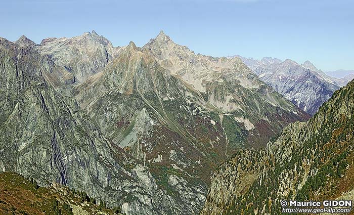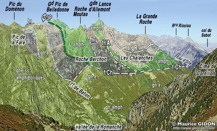 En particulier la bande amphibolitique des Trois Pics descend vers le sud par la combe du lac de Bâton (cf. page "Romanche") puis forme la crête de rive orientale du vallon de la Grande Vaudaine (notamment la Roche Moutas) jusqu'à l'altitude d'environ 1900 m (Roche Berchon). Elle se termine là en butant contre cette grande faille des Chalanches précisément à l'endroit où le tracé vers l'ouest de cette dernière devient très incertain (peut-être est-ce l'indice de leur connexion et du jeu en chevauchement vers l'ouest de l'Unité des Trois Pics par le jeu de cette faille des Chalanches ?).
