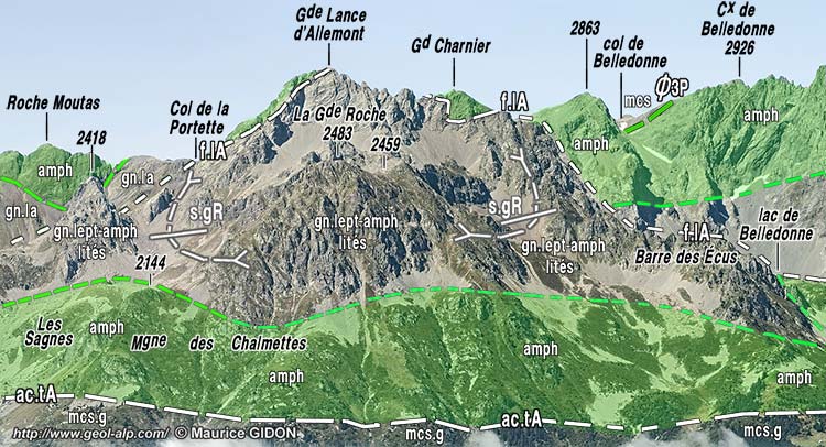 Mais cette bande d'amphibolites, plus étroite, ne forme, en fait, que les abrupts occidentaux du sommet. Ses affleurements sont limités du côté est par une surface de contact verticale que souligne une bande de mylonites qui suit sensiblement la crête. Ceci oblige à y voir une faille de la Lance d'Allemont, en dépit du fait que les lits de gneiss leptyno-amphiboliques des escarpements orientaux de cette crête sont sub-verticaux et simplement plaqués contre elle. De fait, au nord du Grand Charnier il est évident que son tracé ne peut se prolonger que par la cassure qui limite le verrou d'amphibolites qui retient le Lac de Belledonne en y tranchant en biais les gneiss du soubassement du Grand Pic, ployés par le synclinal de la Balmette (voir la page "Grand Pic").