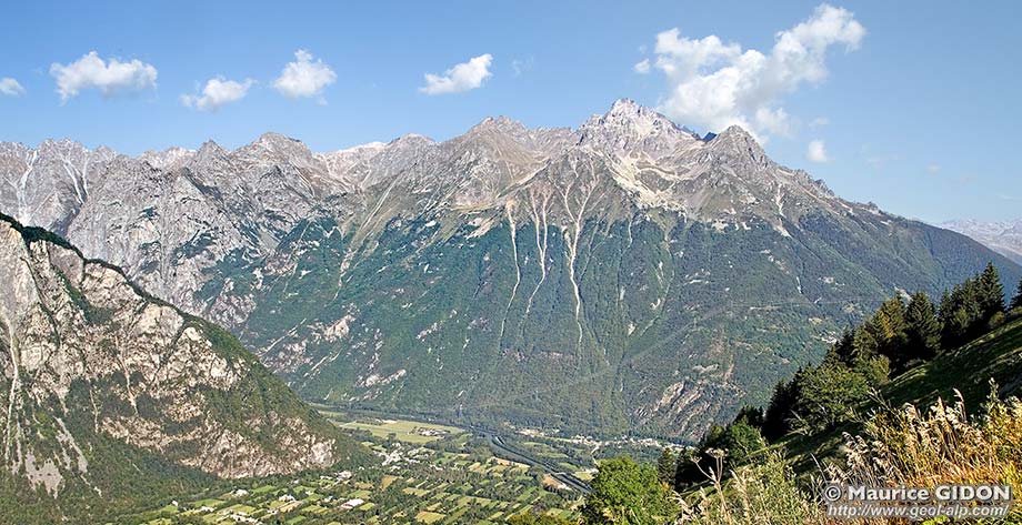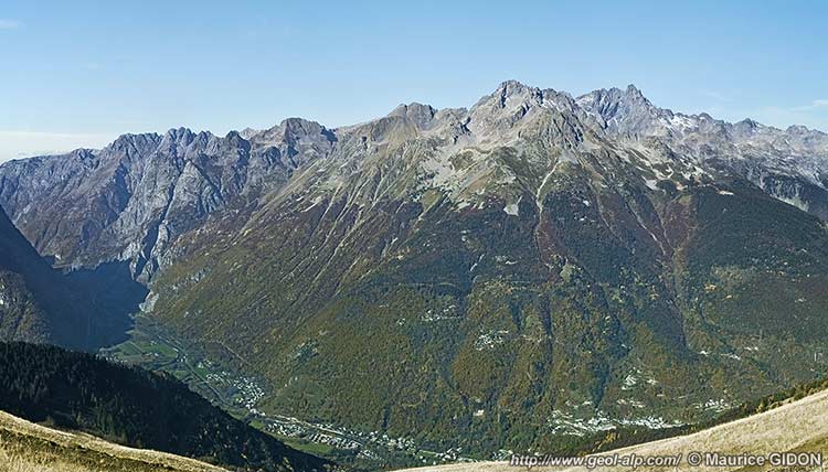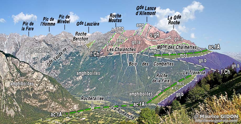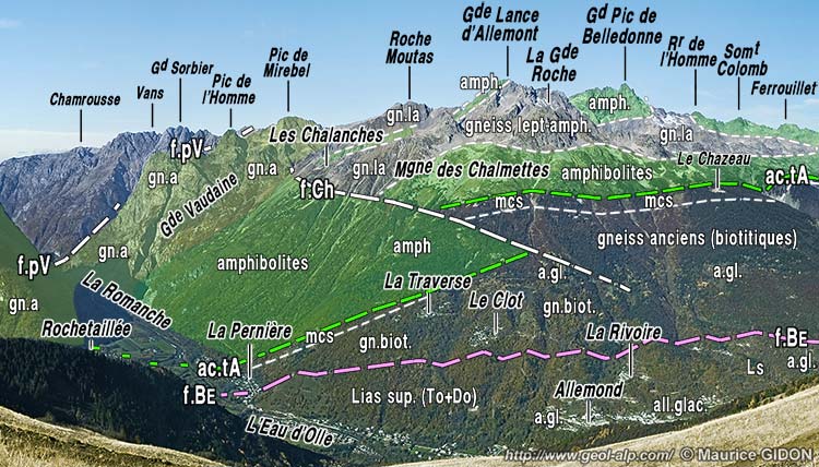 La rive droite de l'Eau d'Olle en amont de l'entrée de la gorge de la basse Romanche, vue du SE, depuis les prairies septentrionales de la Grande Sure (L'Alpe d'Huez). f.pV = faille de la Petite Vaudaine ; f.Ch = faille des Chalanches ; ac.tA = accident de La Traverse d'Allemont : mcs = frange de micaschistes à cipolins et à filons volcaniques ("lamprophyres") ; f.BE= faille de Belledonne orientale. On a surchargé de vert vif les affleurements d'amphibolites de l'unité des Trois Pics de Belledonne. |
