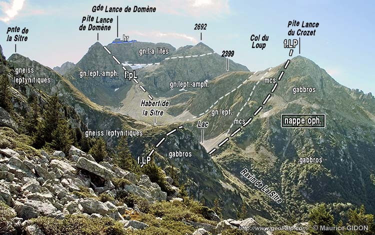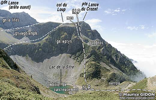 Au SW du Lac Blanc, entre les vallons de Freydane (amont de celui de Saint-Mury) et du Crozet (amont de celui de Lancey), l'arête de la Grande Lance de Domène se détache vers l'ouest de la crête principale du massif de Belledonne. La pyramide sommitale de ce sommet est formée de gneiss amphiboliques qui montrent de beaux litages, d'ailleurs peu inclinés, de leptynites et d'amphibolites régulièrement alternées (ce qui atteste de leur origine volcanique). Ces roches sont en outre couronnées par un petit chapeau de pélites* du Houiller qui repose sur le cristallin par une surface inclinée vers le sud.