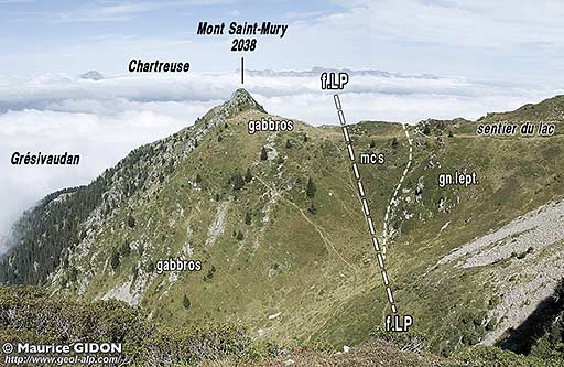 Le versant sud-ouest du Mont Saint-Mury vu du sud depuis les abords du habert de la Sitre f.LP = faille de La Pra (le compartiment gauche est abaissé) ; mcs = micaschistes à grenats. |