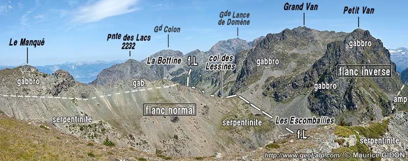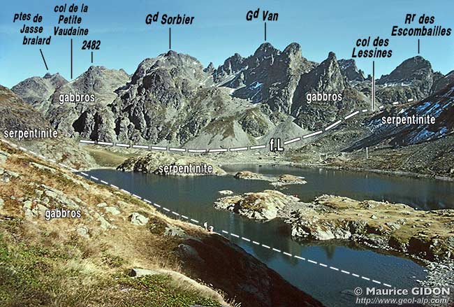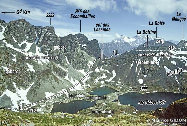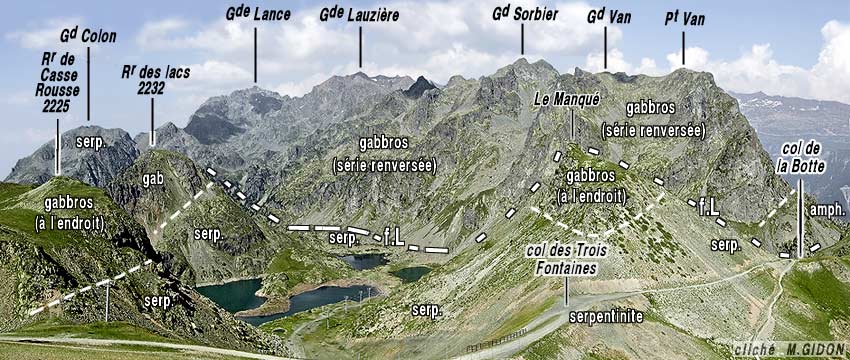 Cette cassure remonte fortement les gabbros du flanc inverse du pli, qui forment les abrupts et les crêtes des Vans et du Grand Sorbier, au NE de la dépression des lacs. Son compartiment occidental, abaissé montre au contraire sur un cœur de serpentinites des chapeaux de gabbros (succession à l'endroit) tel celui de la Bottine et du Manqué, dont les éboulis sont traversés par le chemin qui va du col des Trois Fontaines à celui de la Botte.