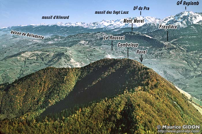 Il faut observer que les axes de ces plis sont obliques par rapport à la bordure de la plaine alluviale du Grésivaudan (leur direction est plus proche de N-S), de sorte que le prolongement septentrional du synclinal de Combeloup rejoint cette bordure dès les abords de Lancey (de sorte que, au nord de cette localité, c'est l'anticlinal de Revel qui affecte les couches de la bordure du Grésivaudan). |