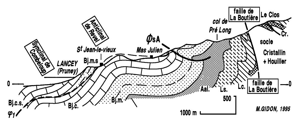 Ces deux crêtes offrent des coupes naturelles assez analogues où l'on voit tout d'abord que la couverture mésozoïque est presque privée de ses termes de base (Lias calcaire), peut-être parce que ces derniers sont stratigraphiquement réduits mais surtout parce qu'ils s'appuient du côté NE contre une faille qui les biseaute en portant en saillie par rapport à eux des grès et schistes houiller : il s'agit là du prolongement de la faille de la Boutière (voir la page "Saint-Mury") qui limite du côté occidental la bande intercalaire entre gneiss du Rameau interne et micaschistes du Rameau externe (voir la page "Prapoutel").