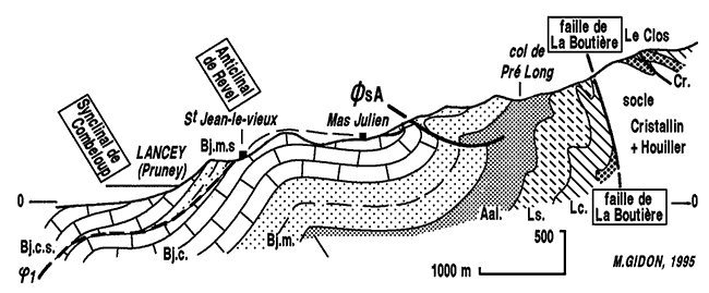 ![]() Les collines de rive droite du Bas Doménon, vues d'avion, de l'ouest, depuis l'aplomb de la plaine de l'Isère à l'est de Meylan. Ø1? = surface de chevauchement du probable redoublement** du Bajocien inférieur; ØsA = chevauchement de Sainte-Agnès ; a.D = anticlinal de Domène ; s.C = synclinal de Combeloup ; a.R = anticlinal de Revel ; f.B = faille de la Boutière ; f.PA = faille du Pré de l'Arc ; c.B = compartiment de la Boutière, pris entre les deux failles précédentes (souvent considéré, à tort, comme représentant l'accident médian de Belledonne). Légende stratigraphique pour le Bajocien des collines bordières : voir la coupe ci-après. ** L'épaisseur considérable et les répétitions de faciès au sein de cette succession ont conduit à se poser la question de savoir si elle ne serait pas redoublée par un chevauchement (voir plus de détails à la page "collines bordières" et/ou se reporter à l'article correspondant). |