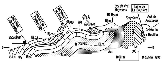 La vallée du Doménon est ouverte aux alentours de Revel dans les marnes du Bajocien basal qui affleurent au coeur de l'anticlinal de Revel (l'Aalénien qui affleure en rive gauche au cœur du pli disparaît en rive droite en raison du plongement axial vers le nord de ce pli qui le conduit à s'enfoncer dans cette direction). Le Bajocien calcaire, sub-horizontal, du flanc oriental de ce pli affleure plus haut dans le versant, au niveau du Rousset. A l'est de ce village il disparaît sous les marnes du Bajocien basal du Mont Morel, vraisemblablement à la faveur du prolongement méridional du chevauchement de Sainte-Agnès (dont on perd là la trace, bien à l'ouest du tracé de la faille de la Boutière, avec laquelle il ne saurait donc être en rapport).