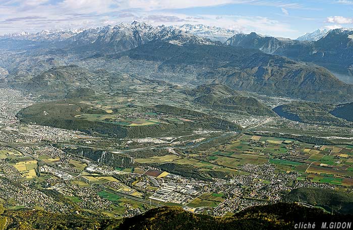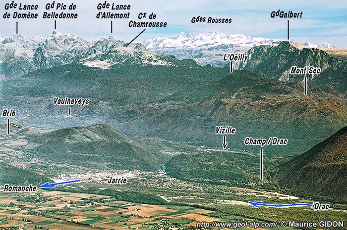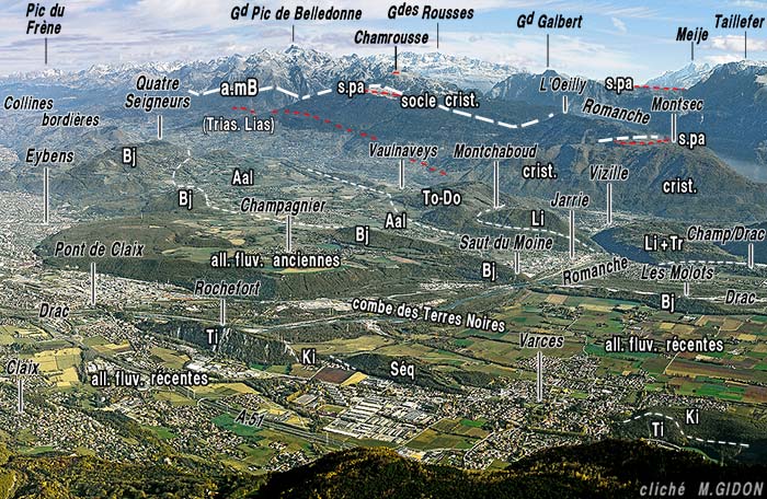 1- Au nord-ouest de Vizille s'allongent les collines de Montchaboud. Elles sont séparées de l'échine de l'extrémité méridionale du socle de Belledonne (voir la page "Mont Sec"), par la combe de Vizille qui se poursuit vers le nord en direction d'Uriage. Jusqu'à Vaulnaveys-le-Haut le bord oriental de cette combe suit sans doute de près l'interface socle cristallin - couverture sédimentaire. Mais en amont de cette localité le tracé de la surface de la pénéplaine anté-triasique s'élève à flanc de versant pour passer sensiblement au niveau du village de Belmont. Le versant ouest de la combe ne montre plus alors que les schistes argileux du Domérien-Toarcien.