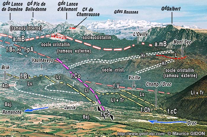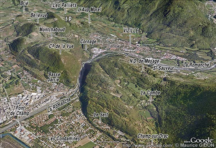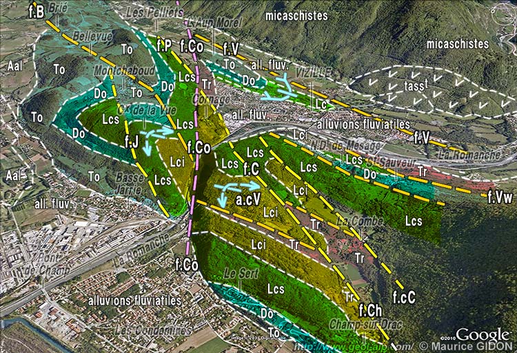 ![]() Vizille et la gorge de la Romanche, vus de l'ouest (vue pseudo-aérienne extraite de Google-earth) Interprétation géologique d'après les levers de J.C. Barféty et M.Gidon [1972] ( publication n° 180 ; voir les levers originaux à la page "cartes") : Du haut à droite au bas à gauche : f.V = faille de Vizille ; f.Vw = faille de Vizille occidentale ; f.cC = faille des Combes de Champ ; f.Ch = faille de Champ-sur-Drac ; f.Co = faille de Cornage ; f.P = faille des Pelliets ; f.B = faille de Brié ; a.cV = anticlinal de la Croix de la Vue ; f.J = faille de Jarrie. Tr = Trias (spilites, gypse et dolomies) ; Lci = Lias calcaire inférieur (Hettangien-Sinémurien) ; Lcs = Lias calcaire supérieur (Lotharingien-Carixien) ; Do = Domérien (calcschistes argileux roux) ; To = Toarcien (calcschistes gris). En définitive on peut distinguer 3 familles de failles, d'orientations différentes, que l'on a tenté de distinguer en leur attribuant 3 couleurs différentes : jaune d'or = N35 (f. de Brié et de Vizille) ; jaune paille = N50 (f. des Combes de Champ) et rose = N75 (f. de Cornage). |