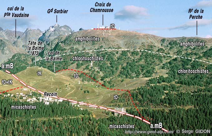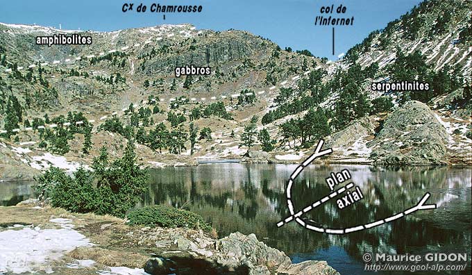 Du côté sud de la station, depuis l'échine de Roche Béranger en descendant vers la cuvette de l'Arselle, l'organisation des affleurements paraît bien traduire également la torsion de la dalle ophiolitique par cette synforme des Lacs Achard : en effet érosion tranche d'abord la succession ophiolitique classique dans le sens descendant jusqu'aux affleurements de serpentinites de Bachat Bouloud. Ces derniers représentent le cœur du pli car on voit réapparaître en contrebas leur enveloppe de gabbros, laquelle fait place, en série renversée, aux amphibolites qui forment toutes les pentes boisées qui descendent de Bachat Bouloud sur le lac Luitel.