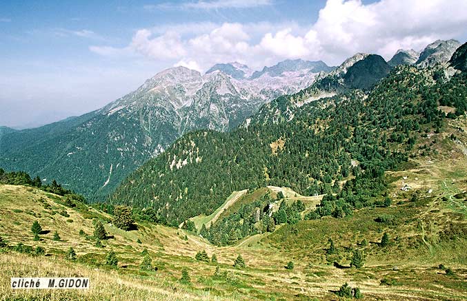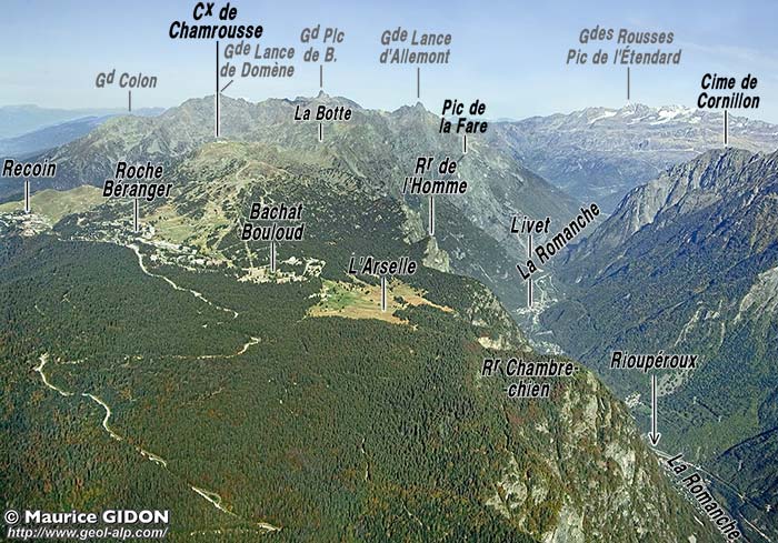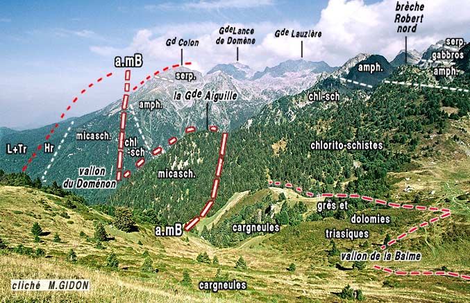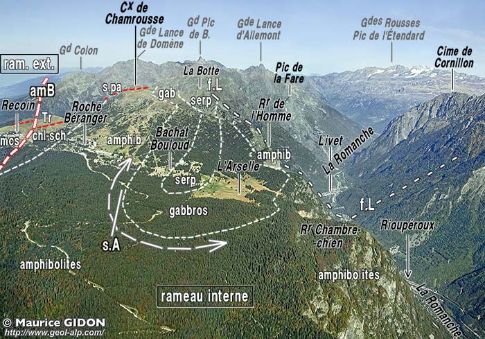 Ces amphibolites du flanc inverse de la dalle ophiolitique constituent aussi la plus grande partie des abrupts qui tombent sur la Romanche. Ce n'est que dans les pentes inférieures de ces derniers qu'affleurent les gneiss clairs de Rioupéroux qui représentent le substratum de la nappe des ophiolites (en amont de Séchilienne, de Rioupéroux jusqu'à Livet, ces gneiss apparaissent donc en demi-fenêtre*). |
