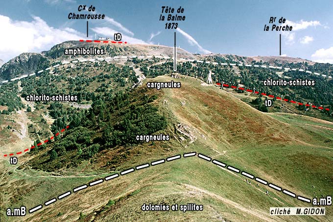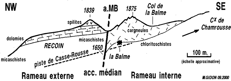 ![]() Coupe schématique, le long de la crête du col de la Balme, à Chamrousse regroupant les observations que l'on peut faire sur les deux versants (Recoin au sud-ouest et piste de Casse-Rousse au nord-est) (La Balme est le nom d'une caverne ouverte à la base des cargneules du versant nord-est de la butte 1875) . Le rejet vertical de l'accident médian de Belledonne est seulement de l'ordre de la centaine de mètres, mais la différence de constitution du Trias, de part et d'autre, suggère que cette composante du mouvement n'est qu'un aspect mineur du jeu de cet accident. Quoi qu'il en soit, il est clair que l'accident médian de Belledonne n'est ni un synclinal ni une faille de chevauchement. NB : c'est par une erreur de couleur et de notation que la carte géologique au 1.50.000° (feuille Vizille) indique la présence de gabbros, à la place des spilites, à la butte 1839. |