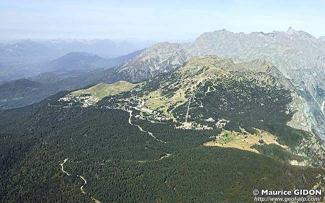 ![]() Le versant ouest de la Croix de Chamrousse (abords de la station de Recoin) vu d'avion, du sud-ouest, depuis l'aplomb de la forêt de Prémol |