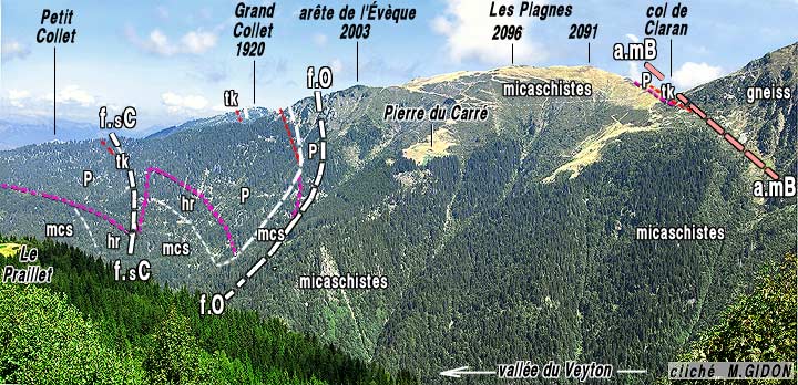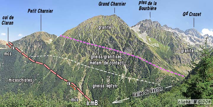 ![]() Le Grand Charnier vu du sud-est, depuis le Crêt Pointu (crête entre Gleyzin et Veyton) a.mB = accident médian de Belledonne. La zone de gneiss injectés de granite, créée par la métamorphisme de contact en marge ouest du pluton des Sept Laux, vient se faire trancher en biseau par l'accident médian de Belledonne, aux abords orientaux du col de Claran (elle ne se prolonge pas, de l'autre côté de la crête, au delà du vallon de Bens et n'existe plus dans le chaînon des Grands Moulins). (suite vers la gauche au cliché précédent) |
