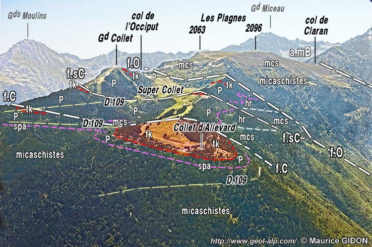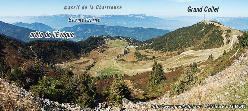 La station et le domaine skiable du Collet d'Allevard occupent une zone de la crête où celle-ci s'élargit en une échine accidentée de petits vallons. Elle correspond à l'extension d'affleurements de pélites noires et grès du Houiller et des pélites vertes pourpres ou grises du Permien qui reposent en chapeau sur les micaschistes du rameau externe de la chaîne.