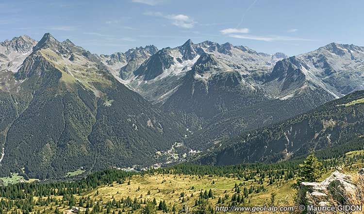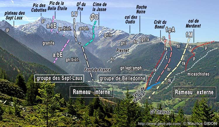 Les ensembles rocheux constitutifs de ce massif, tous rattachables au rameau interne de la chaîne de Belledonne, se répartissent en deux groupes, celui de Belledonne et celui des Sept Laux (voir la page "roches de Belledonne"). Ils sont juxtaposés par la faille N-S d'Allemont - col du Vouteret qui aboutit, dans l'axe de la vallée, exactement à Fond-de-France, de sorte que la constitution de ses deux versants est franchement différente.