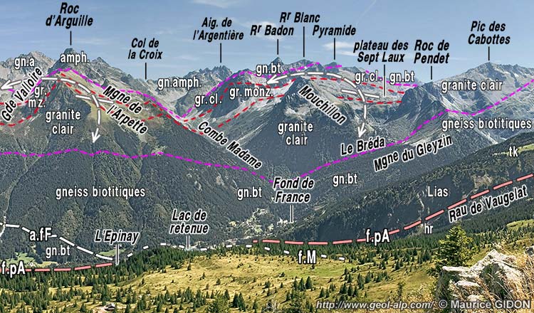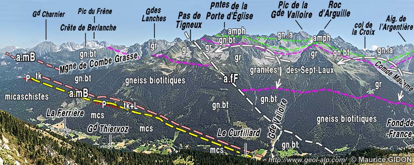 ![]() Les crêtes méridionales du massif d'Allevard (pentes de rive droite du Bréda au niveau de Fond de France) vues du sud-ouest, depuis le col du Pouta (crête nord de la Cime de la Jasse, au dessus de Prapoutel). granite monzonitique* = granite relativement homogène et peu folié, riche en biotite, formant le cœur du pluton* des Sept Laux. Le reste de ce dernier est pour l'essentiel formé de granites clairs dont les limites vis-à-vis de son encaissant de gneiss clairs biotitiques* gn.bt ("à deux micas"), sont indiqués par des tirets longs d'un rose violacé ; a = bandes d'amphibolites ; gn.la = gneiss "leptyno-amphiboliques" (formés d'alternances de lits de leptynites et d'amphibolites). Noter le renversement du contact gneiss / granite sur le versant ouest du pluton* granitique : cette disposition correspond à celle du flanc ouest d'un pli déversé vers l'ouest et s'accorde avec le renversement de la couverture permienne aux abords du col de Merdaret. a.FF = "accident de Fond-de-France" = décrochement de Saint-Rémy (voir cliché suivant). |