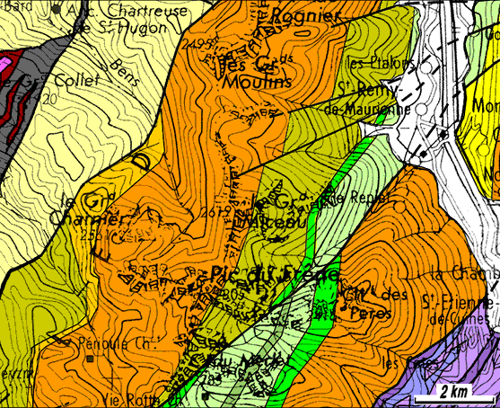 Carte géologique simplifiée des abords du Pic du Frêne (revers oriental du massif d'Allevard).