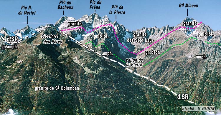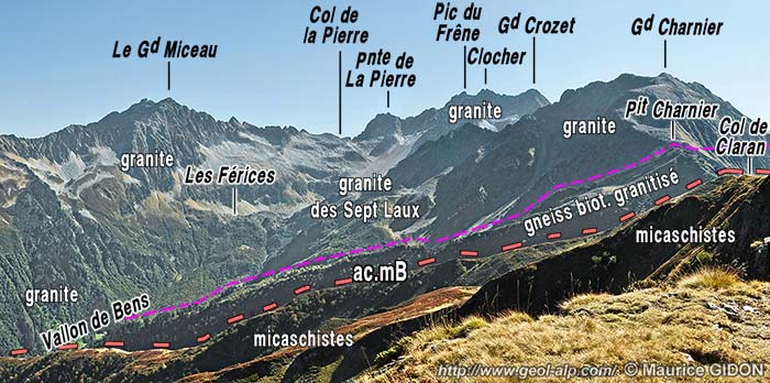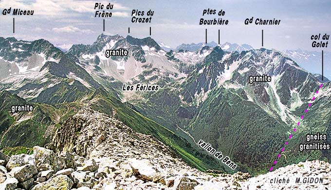 Cet accident constitue plus à l'ouest, dans le versant septentrional du chaînon, la limite méridionale des affleurements de granite des Sept-Laux (voir la page "Puy Gris"). Ici il coupe une largeur de plus en plus grande de l'encaissant oriental du granite des Sept Laux, depuis les gneiss biotitiques anciens de sa partie basse jusqu'aux amphibolites qui les recouvrent.