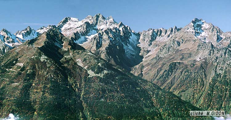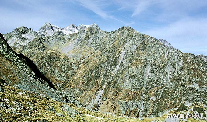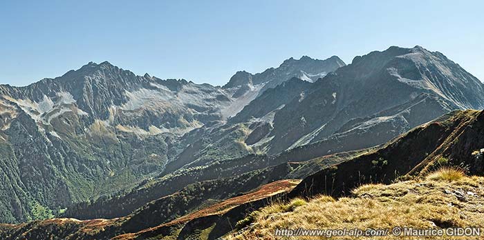 Au contraire les arêtes qui s'en détachent vers l'est sont découpées, presque tout de suite, dans les roches métamorphiques qui s'intercalent entre le granite des Sept Laux et le granite de Saint-Colomban.
