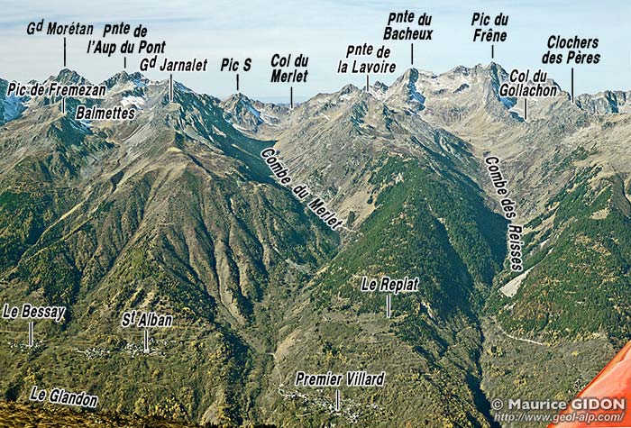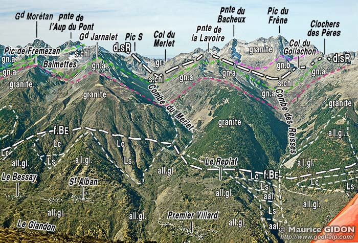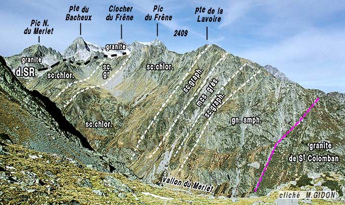 En fait cet ensemble métamorphique intercalaire est traversé en biais par le grand décrochement de Saint-Rémy (voir la page "Sept-Laux, généralités"), qui est orienté SW-NE et franchit obliquement la crête faitière du chaînon au Pic sud du Merlet.