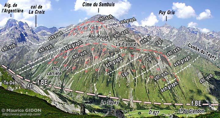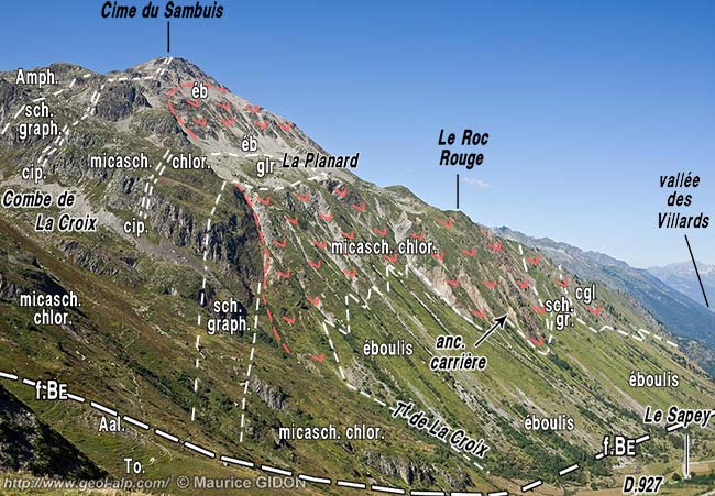 Cette morphologie est en définitive celle d'un énorme tassement dont le rebord d'arrachement, constitué par un petit rebord abrupt frangé d'éboulis, peut d'ailleurs être suivi le long des arêtes est et sud de la Cime du Sambuis où il affecte un tracé en ogive ; en fait la masse tassée est partagée en deux paquets étagés, séparés verticalement par la marche d'escalier du replat de La Planard.