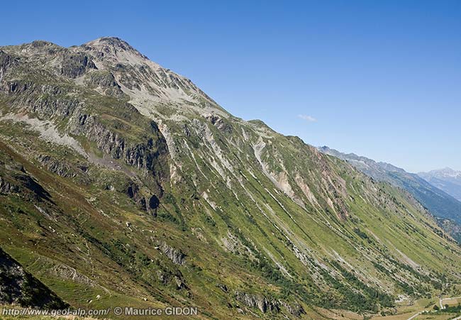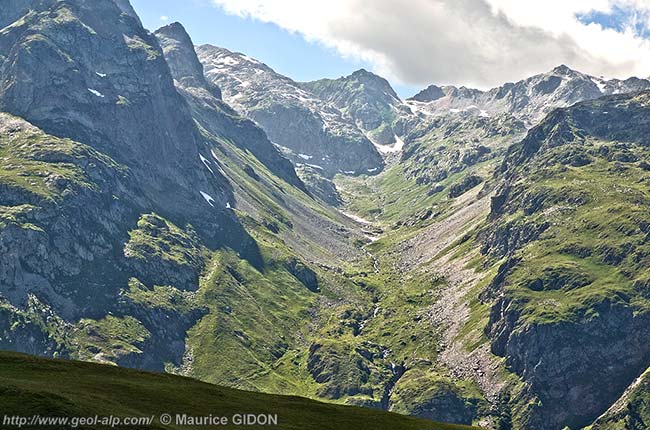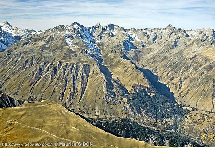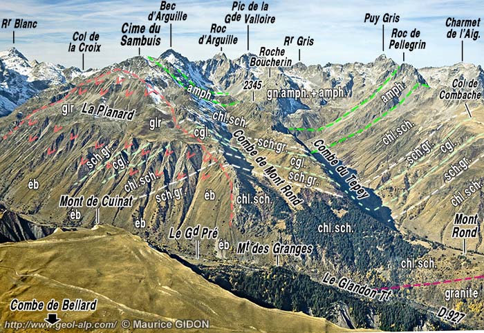 Elles viennent à tour de rôle se terminer sous les éboulis du pied de versant ; ceux-ci cachent le passage de la faille orientale de Belledonne car, dès le pied de l'autre rive, affleurent des roches sédimentaire également disposées en oblique par rapport au tracé du thalweg du torrent du Glandon (page "vallée des Villards").