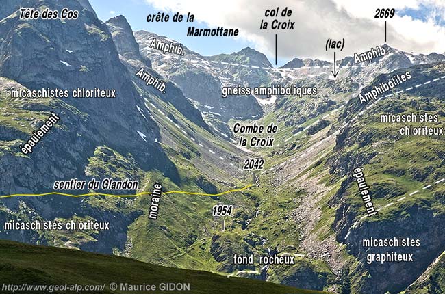 Ces bandes de roches métamorphiques paléozoïques traversent presque transversalement le bas vallon de La Croix et constituent également les plus basses et les plus orientales des Aiguilles de l'Argentière ; elles forment notamment l'épaulement rocheux du pied des Têtes du Cos, que traverse presque horizontalement le sentier du col de La Croix avant de rejoindre le fond du vallon (voir la page "Aiguilles de l'Argentière").