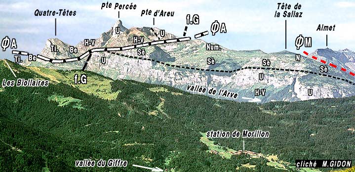 (Chablais)Les pentes boisées de la station de ski de Morillon (échine nord-ouest de la Tête des Prés-les-Saix) sont tout-à-fait en avant-plan et cachent la vallée de l'Arve. Elles sont formées par une klippe* des Préalpes médianes* reposant sur un coussin d'ultrahelvétique*. Le redoublement de la barre tithonique, qui résulte du chevauchement d'Areu (ØA), est mieux visible sur des clichés pris de l'est. f.G = faille de la Grangeat (sectionnée et transportée par le chevauchement d'Areu). ØM = surface de chevauchement des Préalpes médianes. |
