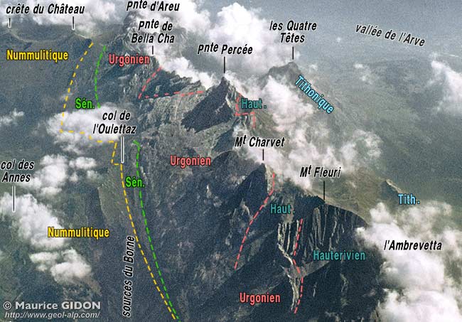 L'ablation de la carapace urgonienne est telle, sur la crête principale, que, au sud du Mont Charvet, l'Urgonien n'affleure même plus que dans la partie basse des crêtes secondaires, NW-SE, qui limitent ces cirques. Dès le Mont Fleuri il ne constitue même plus que les arc-boutants par lesquels ces crêtes viennent se terminer dans la dépression de La Clusaz. Cette tendance va s'aggravant jusqu'au niveau du lac des Confins (vallon de la Petite Torchère). Cependant elle tend à s'inverser ensuite au fur et à mesure que l'on se rapproche du col des Aravis où la dalle urgonienne rejoint presque la crête faîtière.