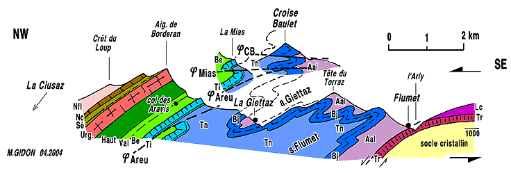 Ces failles sont en relation avec le système de plis couchés et de bandes de froissement qui dessinent, plus à l'est, dans les collines à soubassement de Bajocien et de Lias qui s'étendent jusqu'à la vallée de l'Arly, un système de deux vastes plis en "feuille de chêne"*. Une troisième faille plate très analogue mais de rejet plus important s'observe, plus bas dans l'édifice structural, au niveau de Cordon et de Burzier. Il semble qu'elle doit être considérée comme le prolongement à ces niveaux du chevauchement d'Areu qui affecte la partie plus haute de la succession.