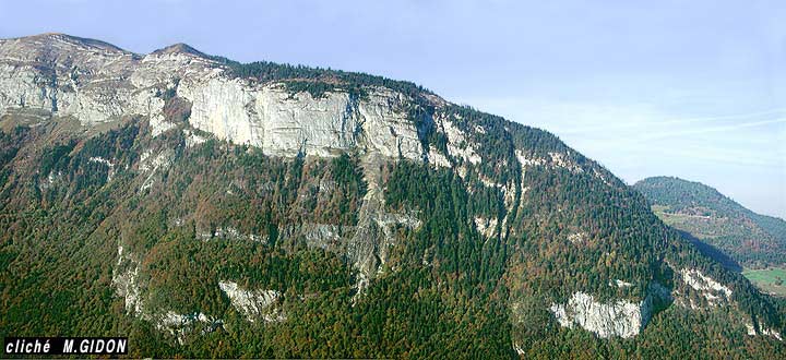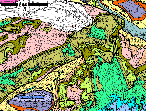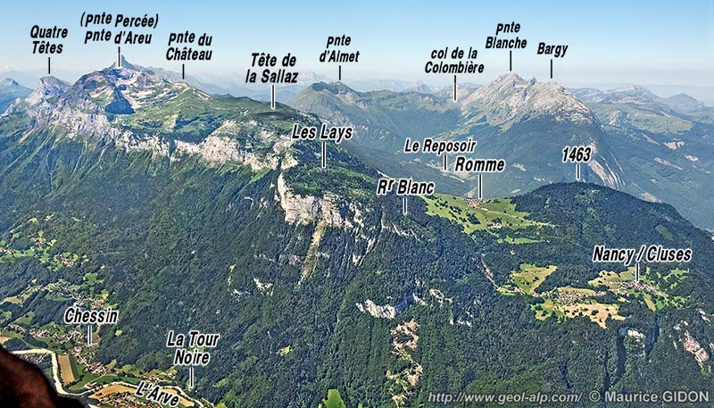 En fait on apprécie mal les effets de la rencontre de ces deux plis car la répartition des affleurements est surtout dominée aux abords de cette localité par le jeu de plusieurs cassures, certaines longitudinales d'autres transversales au pli. À la première catégorie appartiennent les prolongements de la faille de la Colombière et des Bécus, cf page "Bargy", qui correspondent respectivement à celles de Romme et de Nançy). Quoi qu'il en soit, entre Nançy et la Montagne de Chevran, la cluse de la vallée de l'Arve crève beaucoup plus profondément la voûte anticlinale urgonienne du Bargy (dont l'Hauterivien est largement mis à nu) que ne le font, plus au SW, les gorges du Doron du Reposoir (où l'Hauterivien ne perce qu'à peine). |