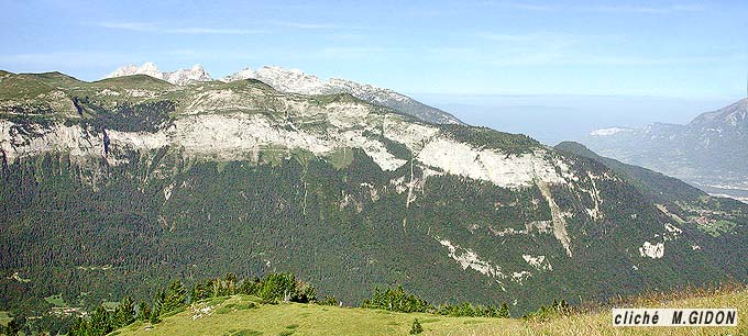 C'est dans ce pli majeur qu'est ouvert, plus à l'ouest, le grand val* du Reposoir, creusé dans les couches nummulitiques du coeur du synclinal, après que l'érosion ait au préalable déblayé les témoins de la nappe des Préalpes médianes qui l'encombrent encore, plus au sud, sur les crêtes de l'Almet et de la Colombière (page "Almet"). |