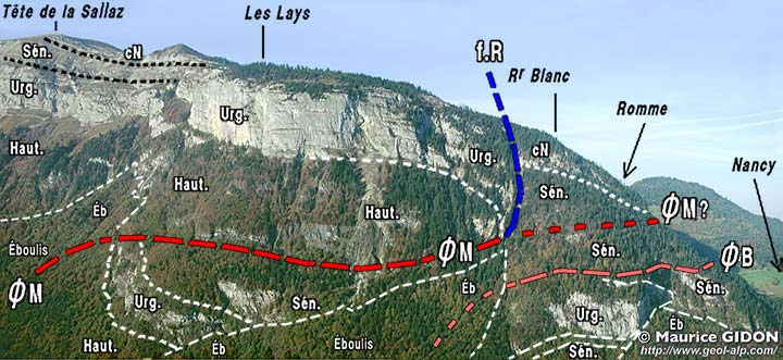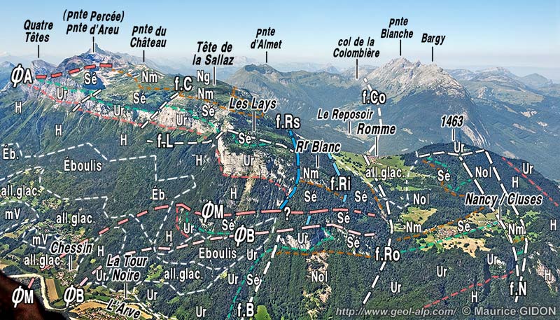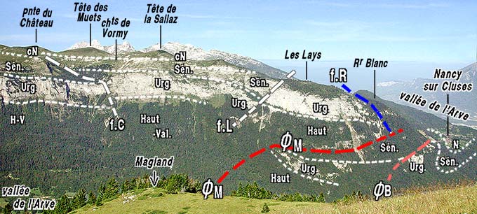 ![]() Détails de la terminaison du chaînon des Aravis, en rive gauche de l'Arve vue de l'est, depuis Les Carroz (sommet du Mont Favy). ØM (en rouge) = chevauchement de Magland ; f.R (en bleu) = faille supérieure du Rocher Blanc(= tronçon supérieur de la faille de Maglan, transporté par le chevauchement de Magland) ;ØB (en rose) = chevauchement de Balme. Pour comparaison et pour plus de détails sur l'interprétation des accidents indiqués ici, se reporter à la page "Carroz - Arâches". |