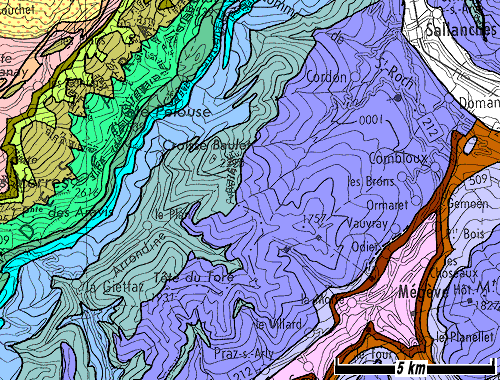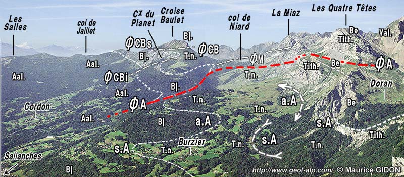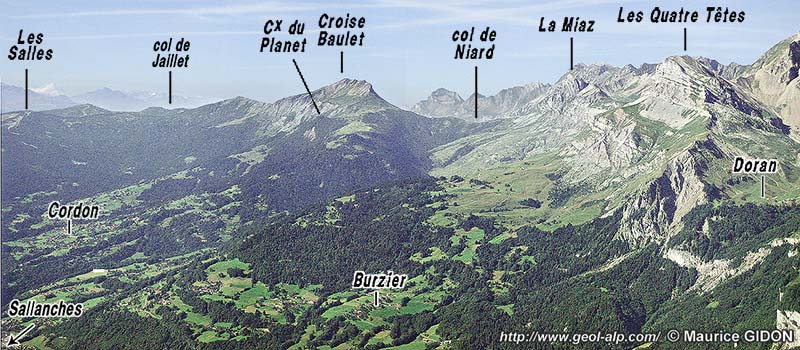 Ces pentes de rive gauche, qui s'abaissent jusqu'à la vallée de l'Arve, sont trop couvertes de végétation pour montrer clairement, à distance, la disposition de leurs couches. Mais, au nord de Cordon, la cartographie géologique y révèle que les Terres Noires s'engagent plus au sud-est sous du Bajocien qui avance en chevauchement vers le nord-ouest. Il y a sans doute là une surface de chevauchement qui prolonge vraisemblablement, à ce niveau, celle qui affecte plus au NW le Tithonique des Quatre-Têtes, puis forme, encore plus au NW, au niveau de l'Urgonien, le chevauchement d'Areu. (voir la page "Croise Baulet").
