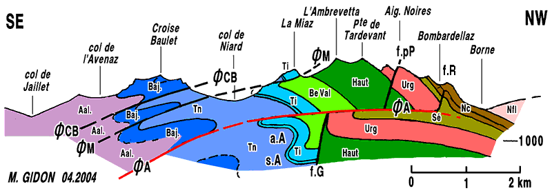 ![]() Coupe du versant oriental des Aravis selon la ligne de partage des eaux Arly - Arve ØCB = chevauchement de Croise Baulet ; ØM = chevauchement de La Miaz ; ØA = chevauchement d'Areu ; ØMa = chevauchement de Magland. s.A = synclinal d'Arpenaz ; a.A = anticlinal d'Arpenaz. Failles extensives anciennes (voir la page"Areu") : f.G = faille de la Grangeat ; f.R = faille de La Rouelletaz (prolongement de la précédente, décalé par le chevauchement d'Areu ) ; f.pP = faille de la Pointe Percée. |