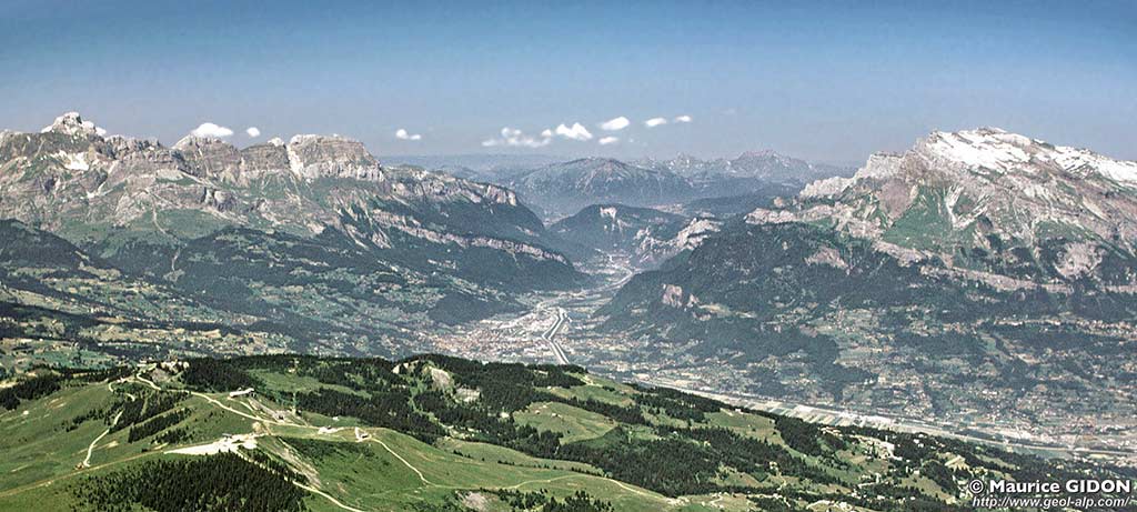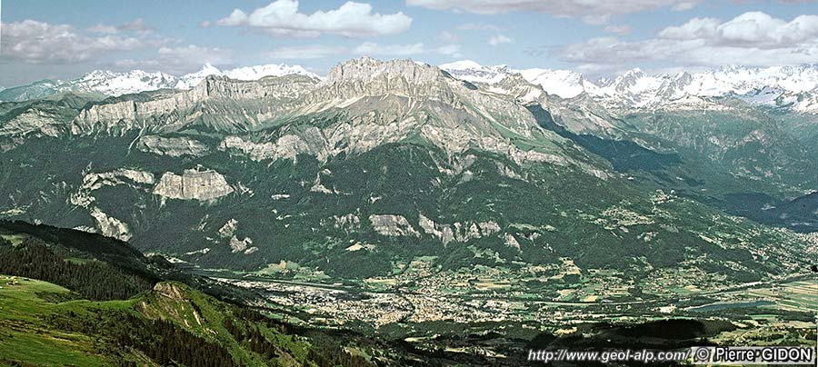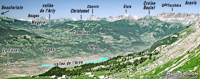 ![]() même fenêtre La cluse de l'Arve d'enfilade, vue d'amont depuis le sommet du Mont Joly. Le surhaussement de la ligne repère de la base du Tithonique, en rive droite est dû au bombement anticlinal des Platières, dont l'axe traverse la cluse à Sallanches et passe par Cordon : l'Urgonien de la voûte de ce pli est respecté par l'érosion en rive droite, alors que sur la rive gauche cette voûte a été crevée jusqu'au Jurassique moyen (le crêt de la Pointe Percée correspond à son flanc ouest). |