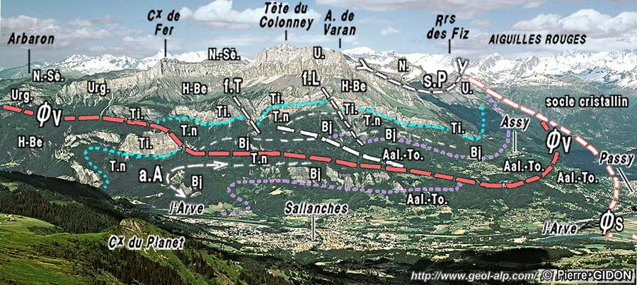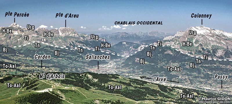 En aval de Sallanches la vallée de l'Arve s'échappe de l'extrémité septentrionale du sillon subalpin, qu'elle traverse entre localité et celle de Passy, en parcourant une longue cluse, orientée presque N-S, qui sépare le massif des Bornes de celui de Sixt. Cette cluse coupe un peu obliquement le système de plis d'axe SW-NE qui se poursuit, de l'un à l'autre de ces massifs. Toutefois il n'y a pas identité d'aspect entre les coupes des deux rives car ces plis plongent tous vers le nord-est, de sorte que sur la rive gauche les voûtes des plis affleurent plus haut et sont plus profondément érodées, particulièrement à la latitude de Sallanches où les niveau calcaires du Crétacé (Urgonien, etc ...) et du Jurassique supérieur ont été enlevés par l'érosion, alors qu'ils sont présents en rive droite (au Colonney).