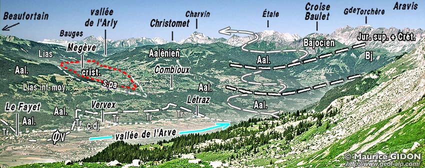 ![]() La rive gauche de l'Arve en amont de Sallanches, vue du nord-est depuis les pentes du col d'Anterne (massif de Platé). s.pa : surface de la pénéplaine anté-triasique, garnie de grès triasiques ; ØV = surface de repos des schistes aaléniens sur la "lame de Vervex" (Trias incluant une interstratification de Houiller). Entre la boutonnière de cristallin de Megève (qui se prolonge vers le nord par des affleurements triasiques discontinus jusqu'à la rive méridionale de la vallée de l'Arve) et les crêtes de Crétacé des Aravis, s'étendent de molles montagnes semi boisées formées par les calcaires argileux et les marnes du Lias et du Jurassique moyen. Elles culminent à Croise Baulet et remplacent, sur cette transversale de la chaîne, le "sillon subalpin", qui a été ouvert par l'érosion quaternaire plus au sud-ouest. On a schématisé leur structure (en chevauchements plats et plis très déversés), par un dessin symbolique, qui fait fi de l'exactitude topographique. Ce type de structure est également celui que l'on observe en bordure gauche (orientale) de la boutonnière de Megève, dans le chaînon du Mont Joly (voir schéma ci-après). |
