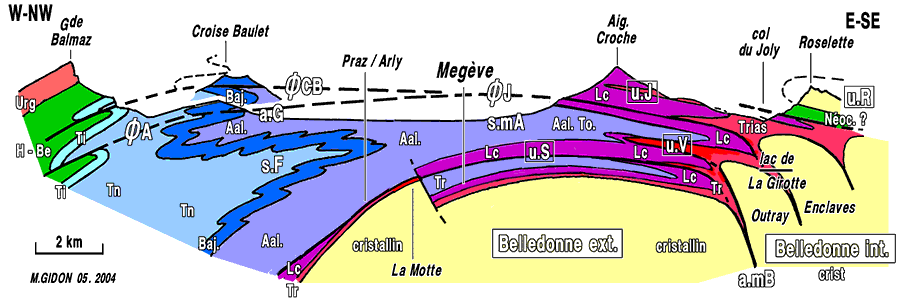 D'autre part il paraît hautement probable que ce style tectonique, qui consiste en bandes plissées alternant avec des surfaces de chevauchement plates, sur les flancs de grands plis couchés, ne fait que poursuivre vers le nord celui qui régit largement, plus au sud et plus bas dans la succession stratigraphique, la structure du Mont Joly. C'est lui aussi que l'on retrouve, à des variantes près, dans le massif de Sixt.