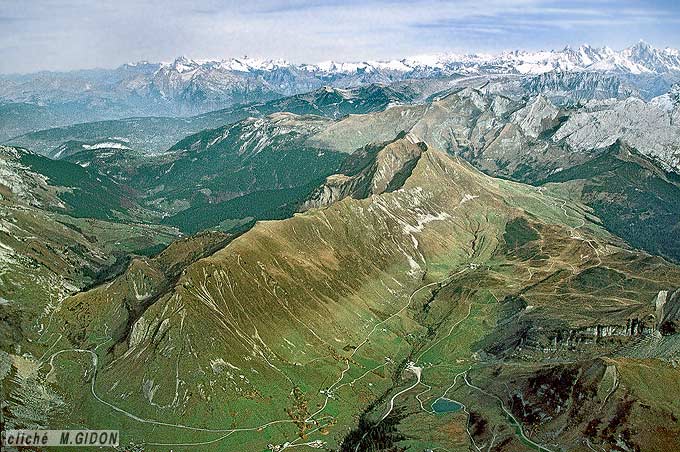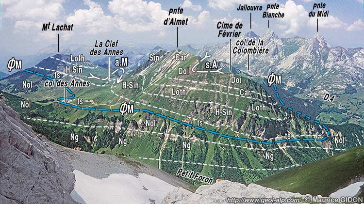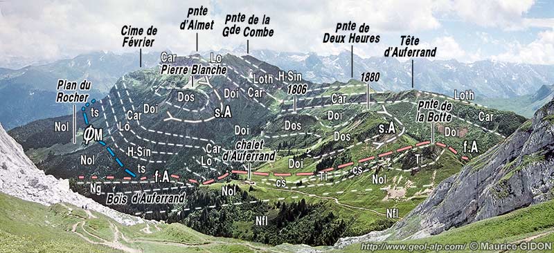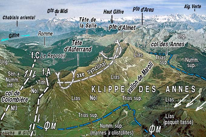 ![]() le versant méridional de la crête Auferrand - Almet vu d'avion, d'ouest - sud-ouest. Ce cliché montre presque la totalité de la klippe* des Annes (sa partie plus méridionale est décrite à la page "Mont Lachat de Châtillon") Le versant septentrional de la crête tombe brutalement sur la dépression du Reposoir qui suit, depuis Romme, le cœur nummulitique du cœur du synclinal de Serraval. Ce contraste résulte de ce que l'érosion y a déblayé les terrains des nappes internes, qui y reposaient là aussi sur le Nummulitique autochtone, alors qu'elle n'y est pas parvenue entre le col de la Colombière et le col des Annes. ØM (en bleu) = surface de chevauchement de la nappe des Préalpes Médianes. Sur ce cliché l'axe du synclinal d'Auferrand est réellement visible sur la transversale de la Pointe d'Almet ; en avant gauche il est par contre masqué, car il passe dans le versant nord de la Tête d'Auferrand (voir le cliché suivant). A gauche, le flanc nord-ouest du synclinal de Serraval est rompu par deux failles à rejet à la fois extensif et coulissant : f.C = faille de la Colombière ; f.A = faille d'Auferrand. |