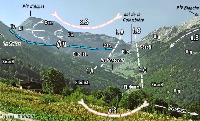 ![]() Le vallon du Reposoir, vu du nord-est, depuis Romme La partie septentrionale de la klippe* des Annes domine la dépression du Reposoir, dans laquelle les terrains des nappes internes ont été déblayé par l'érosion. ØM = surface de chevauchement de la nappe des Préalpes Médianes ; s.S = synclinal de Serraval - le Reposoir ; a.B = anticlinal du Bargy (flanc sud-est). Le flanc ouest du synclinal de Serraval est rompu par deux failles à rejet à la fois extensif et coulissant : f.C = faille de la Colombière ; f.A = faille d'Auferrand. Elles font remonter à l'affleurement la carapace urgonienne du flanc oriental de l'anticlinal du Bargy et empêchent le flysch nummulitique gréso-marneux, soubassement normal de la formation olistolitique ("flysch à lentilles" : Fl.ol.) d'affleurer aussi largement qu'au sud de la crête de l'Almet, dans le secteur La Clusaz - Grand Bornand. |