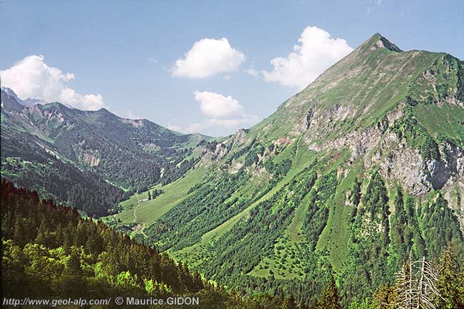 ![]() Le versant septentrional du col des Annes, vu du NE, depuis les abords des chalets de Méry (versant ouest de la pointe d'Areu). ØM = chevauchement basal de la nappe des Médianes ; s.A = synclinal E-W d'Auferrand, antérieur au charriage (voir la page "Almet") : il est vu très obliquement à son axe. Nol = formation olistolitique terminant la sédimentaire nummulitique ; Ng = Nummulitique gréseux ("grès de Taveyannaz") ; Nfl = flysch schisto-gréseux nummulitique. Le cliché est pris selon la direction azimutale du flanc oriental du synclinal de Serraval - Le Reposoir, dont les couches sont vues d'enfilade et montrent leur pendage vers la droite (vers l'axe du pli) : on constate que la surface de charriage des Médianes plonge de la même manière et qu'elle a donc, elle aussi, été basculée par ce pli (qui est de fait le plus tardif de l'histoire tectonique de ce secteur). voir la coupe en fin de page (elle est orientée à l'envers par rapport à ce cliché). |