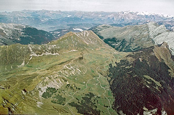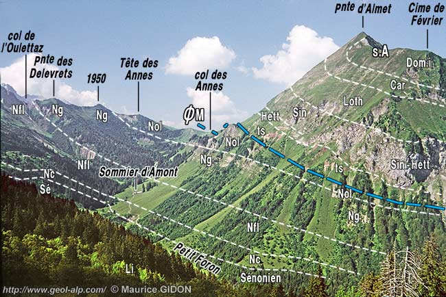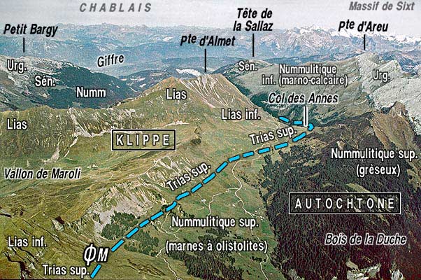 ![]() Le versant méridional du col des Annes vus du SW, d'avion, dans l'axe du synclinal de Serraval. ØM = chevauchement basal de la nappe des Médianes. |